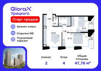 Продаётся 2-комнатная квартира в строящемся доме (Корпус 1), срок сдачи: II-кв. 2028, общей площадью 47.78 кв.м., на 4 этаже. GloraX Урицкого - это новый квартал, рожденный в сердце Московского района Казани, там, где встречаются энергия большого города и тишина старых парков. Проект создает пространство для тех, кто хочет чувствовать себя в центре событий, но при этом возвращаться домой в атмосферу уюта и спокойствия.