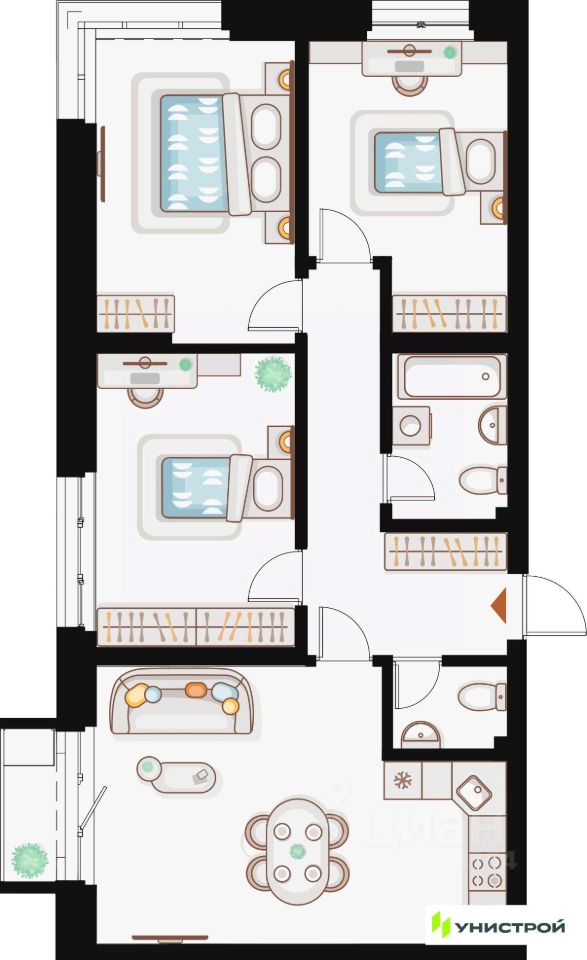 В квартирах выполняется предчистовая отделка с использованием качественных материалов: металлические двери, тепло- и шумоизоляция, энергоэффективные стеклопакеты, скрытая разводка коммуникаций и радиаторы с терморегуляцией.