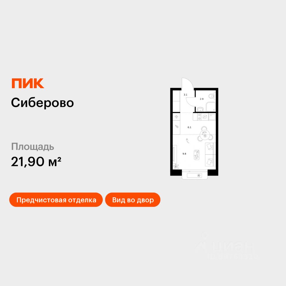 Продаётся квартира-студия площадью 21,9 кв.м на 5 этаже 16 этажного дома (Корпус 3, Секция 1) проекта ПИК Сиберово. Светлый просторный подъезд на уровне земли, функциональная планировка, большие окна, предчистовая отделка.