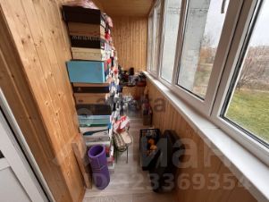 Просторная лоджия длиной 6 метров обшита деревом, на полу линолеум, установлены стеклопакеты, имеется встроенный шкаф и вместительный сундук для хранения вещей.
