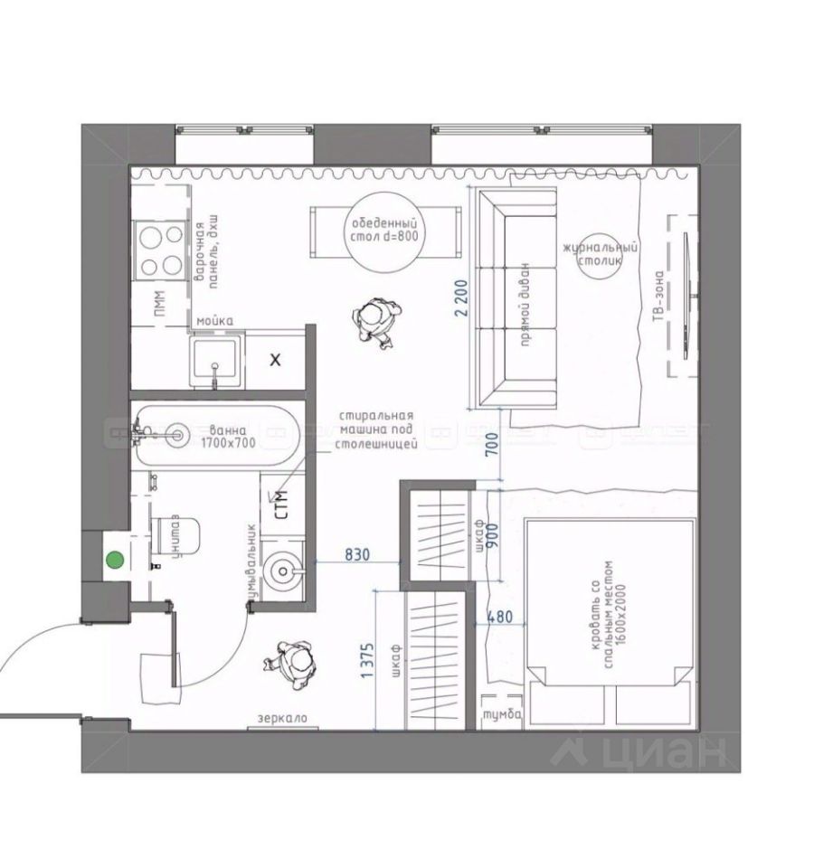 Квартира укомплектована всей необходимой мебелью и техникой.