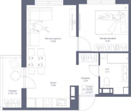 Уютная и продуманная 1-комнатная квартира с просторной кухней-гостиной, из которой открывается выход на лоджию. Для большего освещения в гостиной 2 окна. В прихожей есть место для хранения вещей, а кухонная зона спрятана в нише, что позволяет зонировать пространство. В проекте предусмотрена отдельная спальная комната.