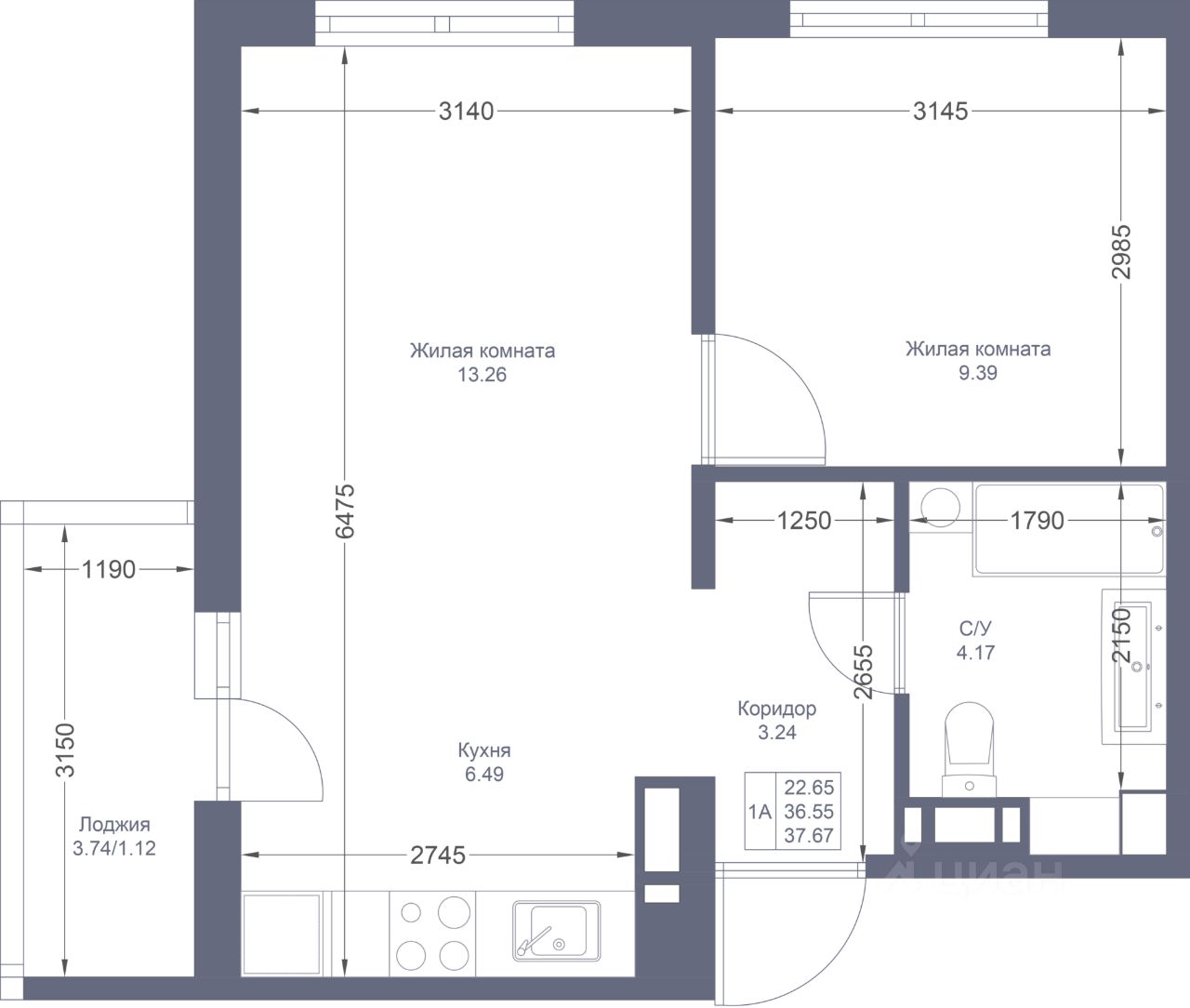 Продается 1-комнатная квартира  5 площадью 37,67 кв.м на 2 этаже 10-ти этажного дома.