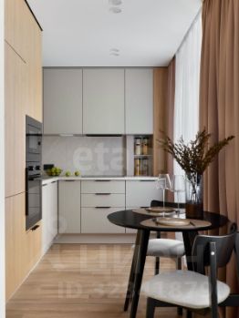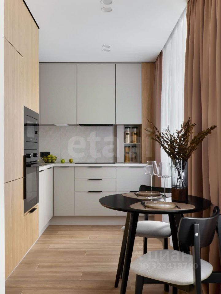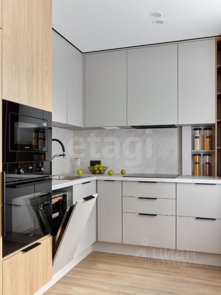 - Новая бытовая техника на кухне: варочная панель, вытяжка, духовка, посудомоечная машина, встроенный холодильник и морозильная камера.