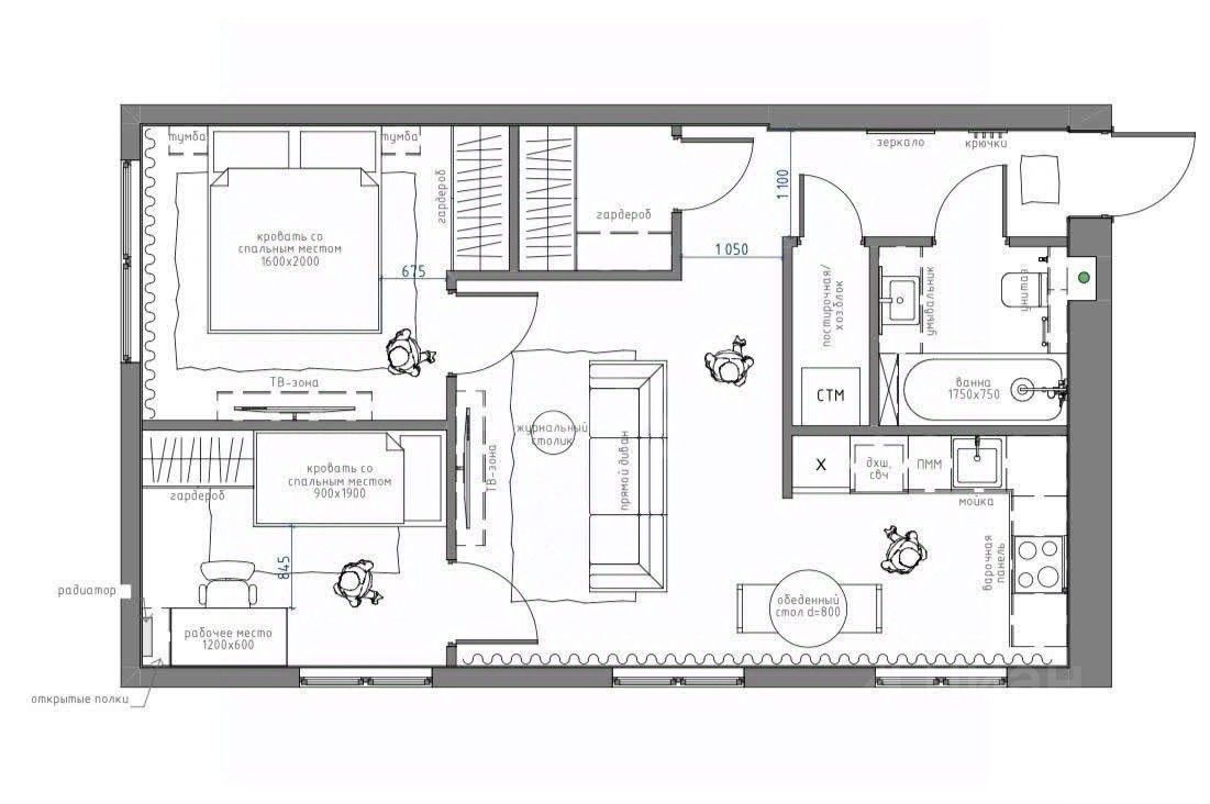 Просторная планировка: светлые комнаты, большая кухня-гостиная, две спальни, гардероб, совмещённый санузел и постирочная комната.