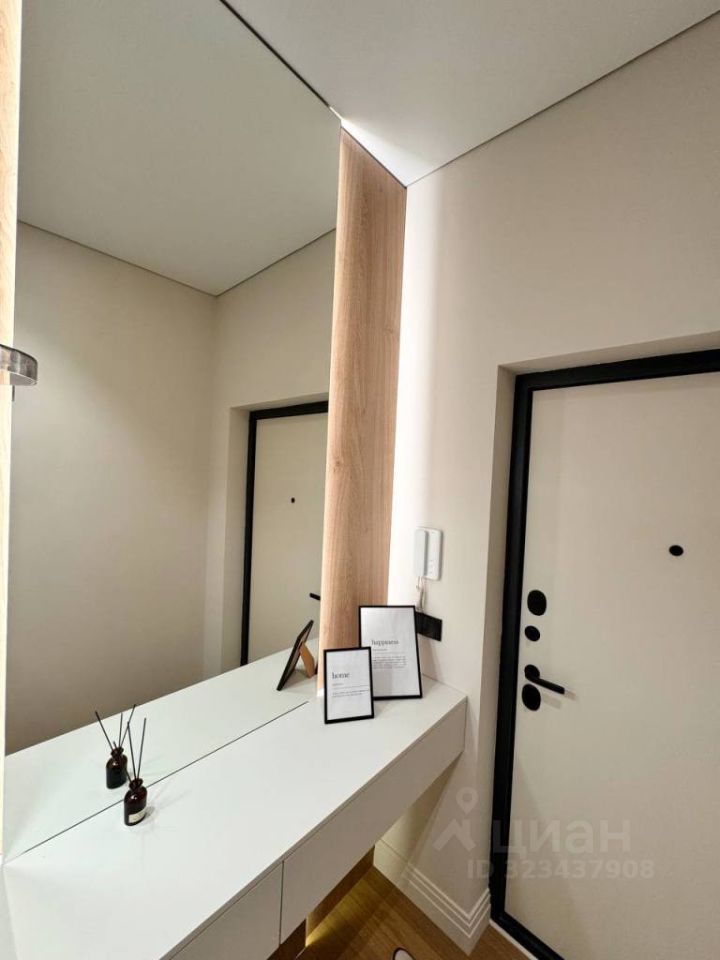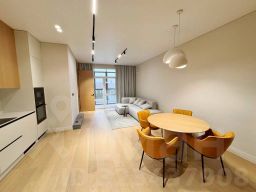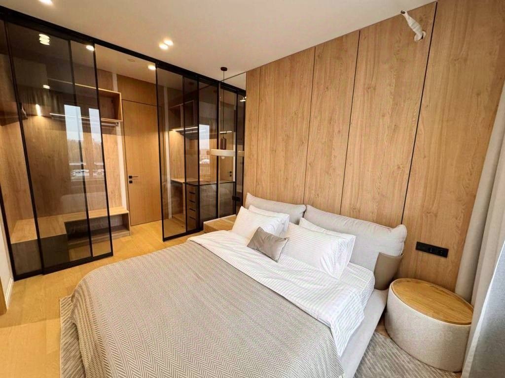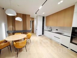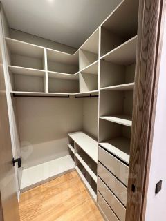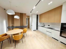 Квартира сочетает в себе концептуальный стиль и минимализм. Мебель по индивидуальному заказу вписана в интерьер таким образом, что её не заметно, при высокой функциональности. Это создаёт простор в каждом помещении. Стильный кухонный гарнитур, стеклянные шкафы с алюминиевым профилем. Квартира укомплектована мебелью, предметами интерьера, текстиля, декором, кухонный гарнитур с вместительной посудомоечной машиной, встроенной техникой.