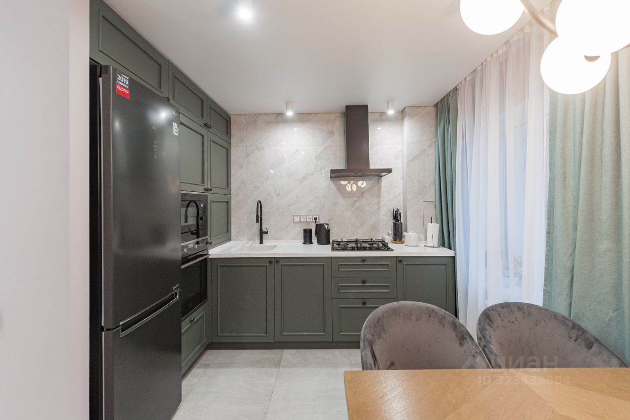 Кухня в эмали со столешницей из акрилового камня и литой раковиной — остаётся новым владельцам.