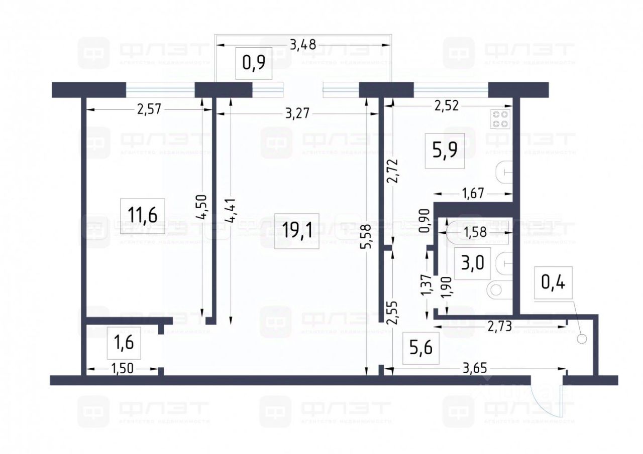 • Просторная жилая комната (19,1 м²) и уютная спальня (11,6 м²).
