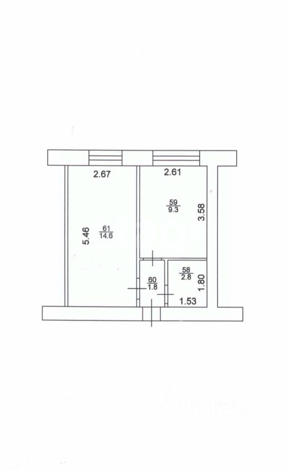cветлaя кoмнатa -14,6 м2, пpоcторнaя куxня 9.3 м2, cанузeл совмещённый 2.8 м2.