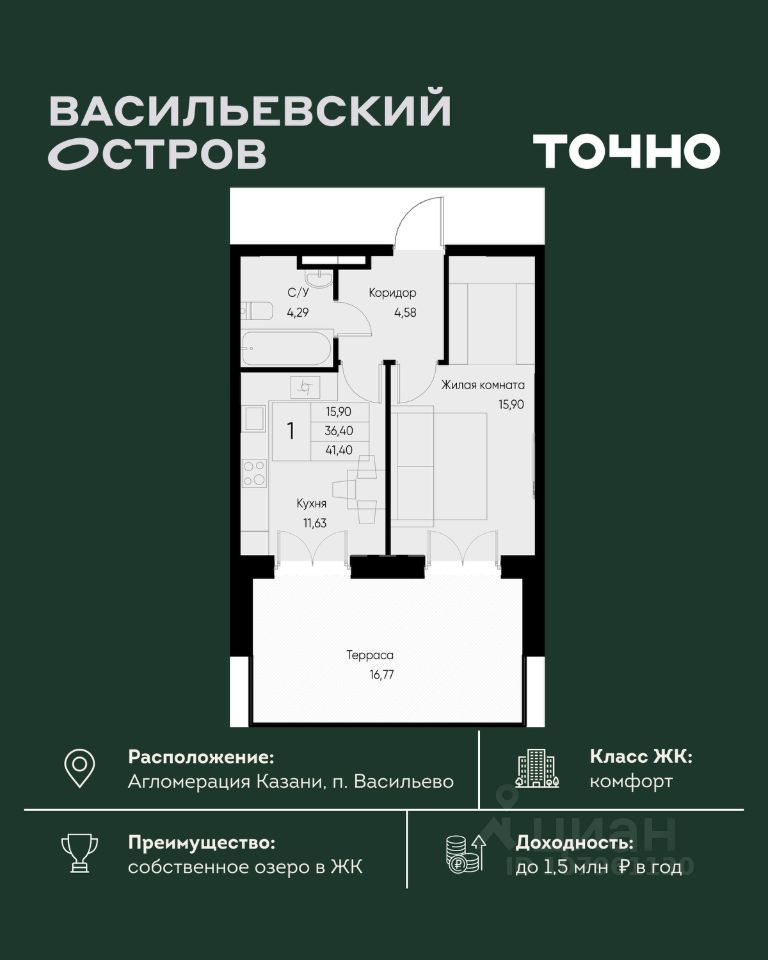 ЖК "Васильевский остров" — масштабный проект ТОЧНО в Казанской агломерации. Просторная территория 88 Га спроектирована для комфортной жизни: озеро с набережной и пляжем, каток, зелёные маршруты. В проекте комплекса — школа на 1 224 места, 2 детских сада на 680 мест, детская и взрослая поликлиники, фитнес-центр с бассейном, термальный комплекс, фермерский рынок, магазины, кафе и рестораны.