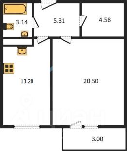 Квартира имеет классическую планировку: общая площадь 47 м², большая светлая комната 20 м² с выходом на застекленный балкон, уютная кухня с обеденной зоной, оборудованная гардеробная, санузел и коридор.