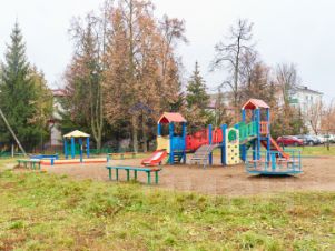 Большой, просторный зеленый двор, оборудованная детская площадка