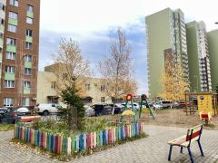 Двор: Ухоженная территория, современная детская площадка для всех возрастов, спортивная зона с тренажерами и баскетбольной площадкой.