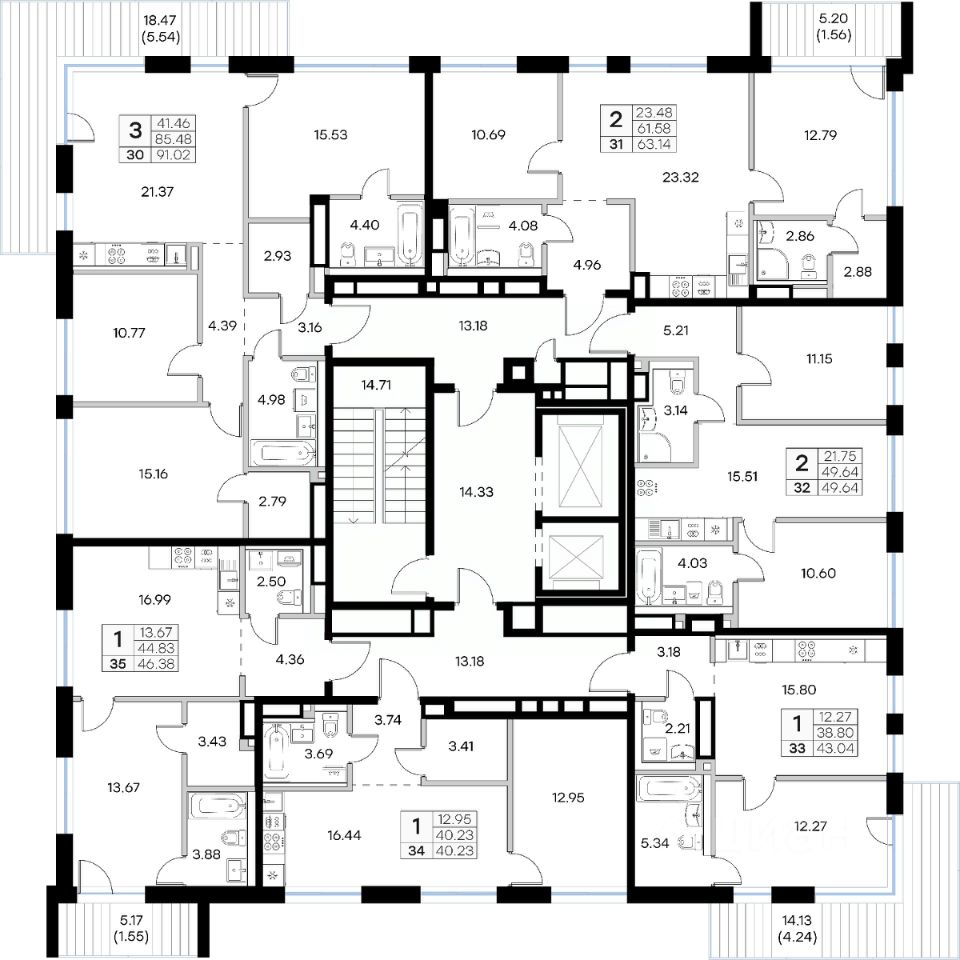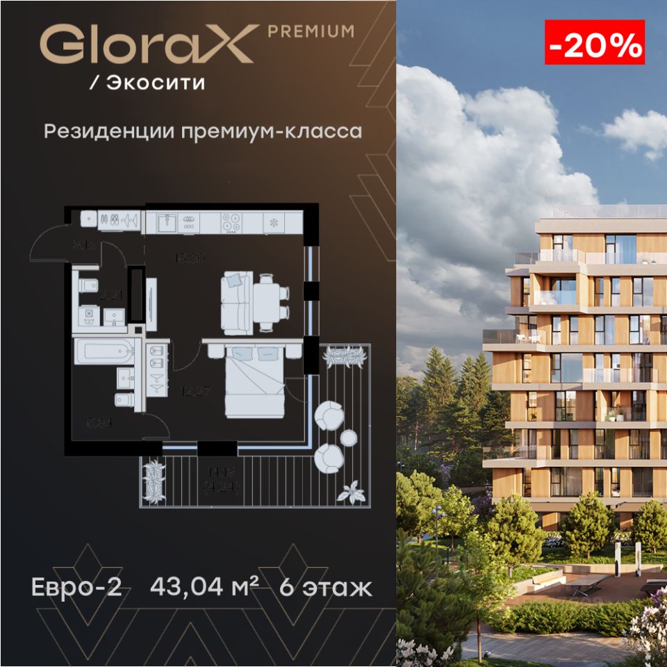 Продается 1-комн. квартира на 6-м этаже в строящемся проекте премиум-класса GloraX Premium Экосити. Общая площадь лота составляет 43,04 кв. м, из которых 12,27 кв. м отведено под жилую и 15,80 кв. м под кухонную зону. Номер квартиры - 33