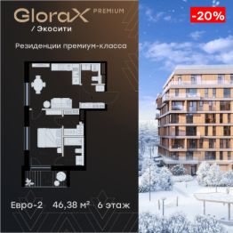 Продается 1-комн. квартира на 6-м этаже в строящемся проекте премиум-класса GloraX Premium Экосити. Общая площадь лота составляет 46,38 кв. м, из которых 13,67 кв. м отведено под жилую и 16,99 кв. м под кухонную зону. Номер квартиры - 35