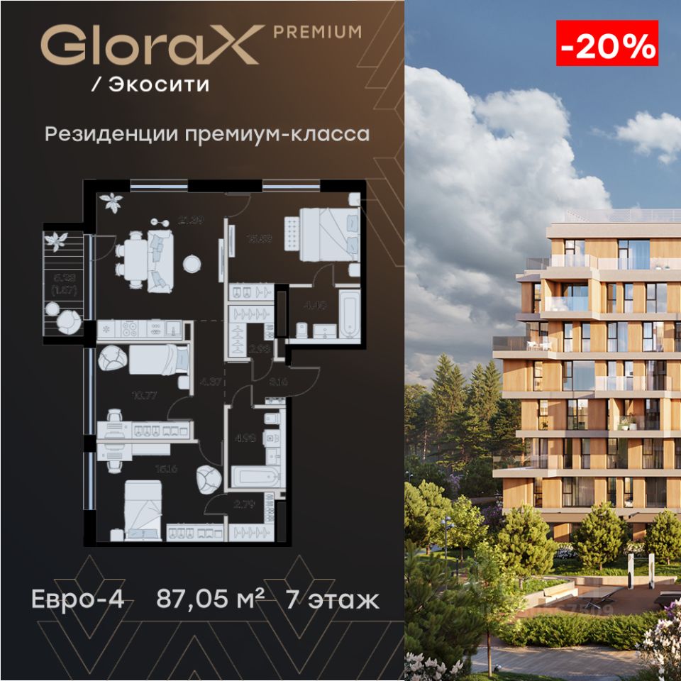 Продается 3-комн. квартира на 7-м этаже в строящемся проекте премиум-класса GloraX Premium Экосити. Общая площадь лота составляет 87,05 кв. м, из которых 41,46 кв. м отведено под жилую и 21,39 кв. м под кухонную зону. Номер квартиры - 36