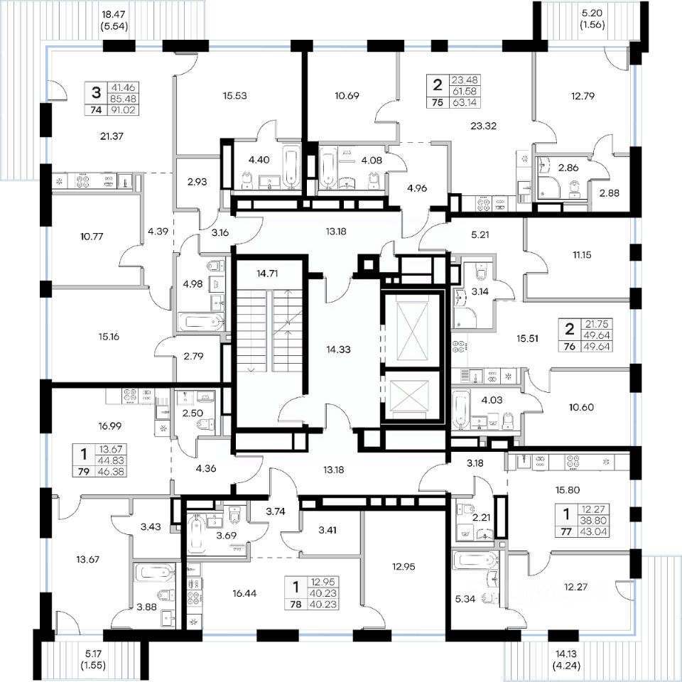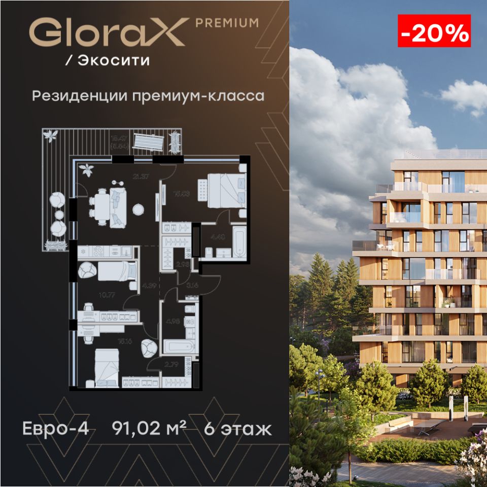 Продается 3-комн. квартира на 6-м этаже в строящемся проекте премиум-класса GloraX Premium Экосити. Общая площадь лота составляет 91,02 кв. м, из которых 41,46 кв. м отведено под жилую и 21,37 кв. м под кухонную зону. Номер квартиры - 74