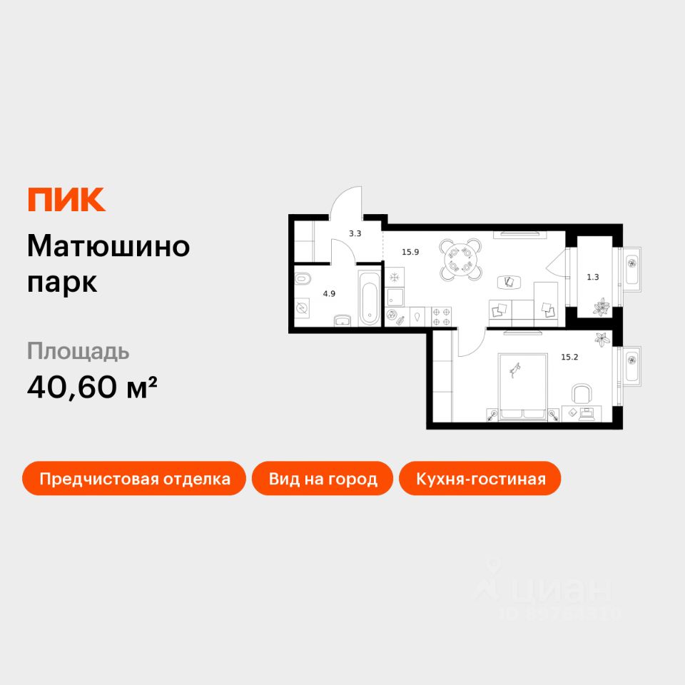 Продаётся 1-комн. квартира площадью 40,6 кв.м на 13 этаже 17 этажного дома (Корпус 3, Секция 1) проекта ПИК Матюшино парк. Светлый просторный подъезд на уровне земли, функциональная планировка, большие окна, предчистовая отделка.