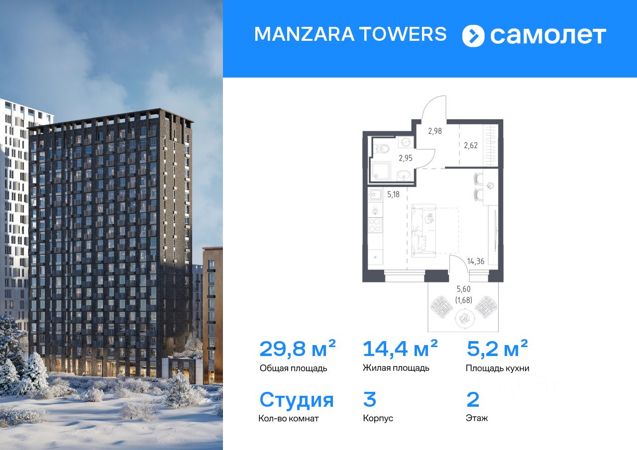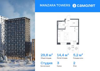 Строим кварталы для жизни с заботой о будущем. Предлагается квартира студия комфорт-класса 29,77 кв.м в корпусе 3 на 2 этаже, в MANZARA TOWERS