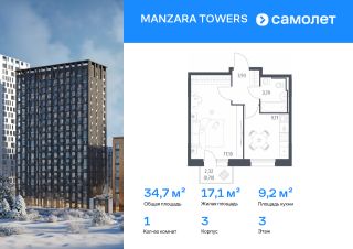 Строим кварталы для жизни с заботой о будущем. Предлагается 1-комнатная квартира комфорт-класса 34,69 кв.м в корпусе 3 на 3 этаже, в MANZARA TOWERS