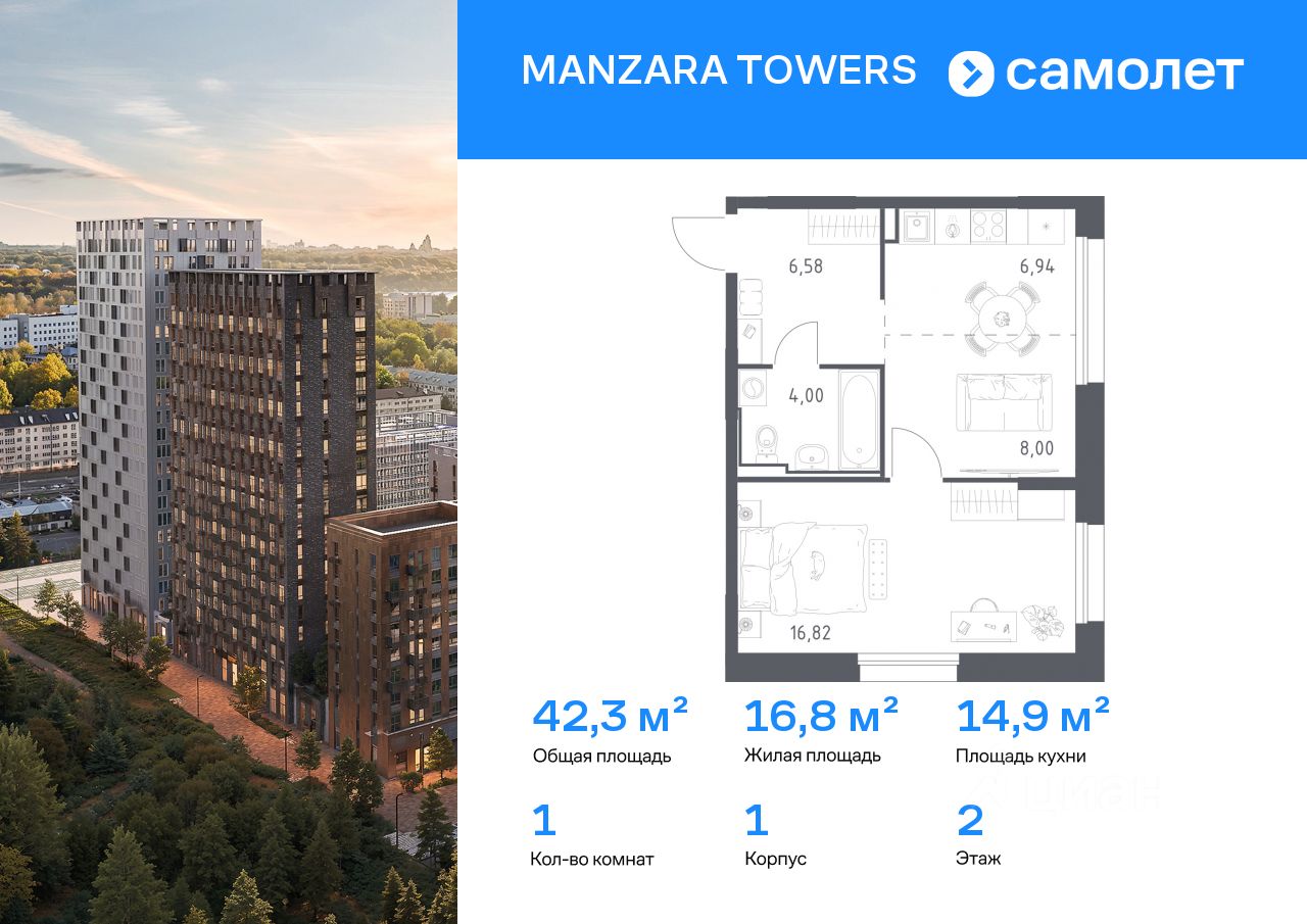 Строим кварталы для жизни с заботой о будущем. Предлагается 1-комнатная квартира комфорт-класса 42,34 кв.м в корпусе 1 на 2 этаже, в MANZARA TOWERS