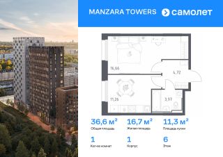 Строим кварталы для жизни с заботой о будущем. Предлагается 1-комнатная квартира комфорт-класса 36,61 кв.м в корпусе 1 на 6 этаже, в MANZARA TOWERS