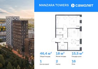 Строим кварталы для жизни с заботой о будущем. Предлагается 1-комнатная квартира комфорт-класса 46,42 кв.м в корпусе 2 на 16 этаже, в MANZARA TOWERS