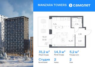 Строим кварталы для жизни с заботой о будущем. Предлагается квартира студия комфорт-класса 31,19 кв.м в корпусе 2 на 2 этаже, в MANZARA TOWERS