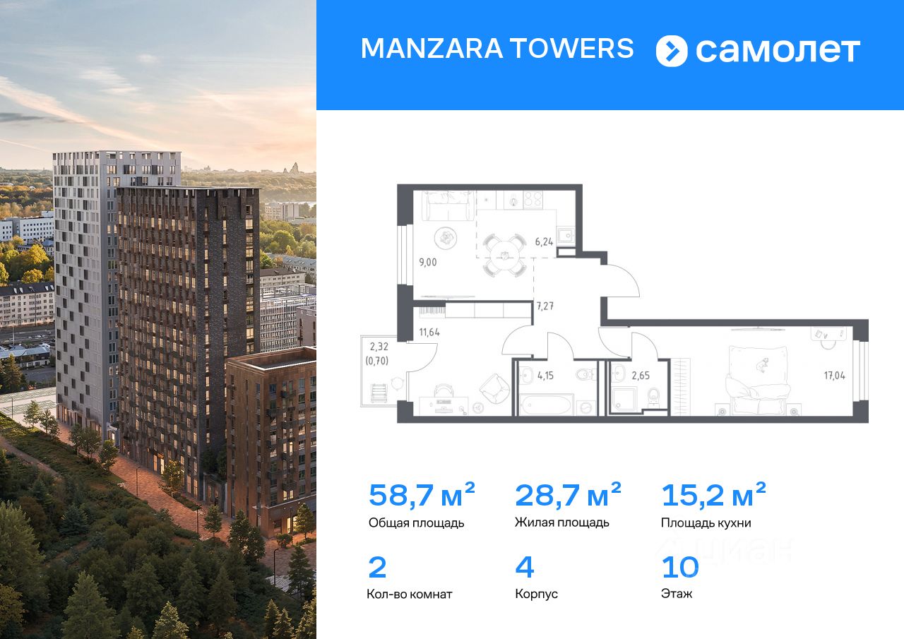 Строим кварталы для жизни с заботой о будущем. Предлагается 2-комнатная квартира комфорт-класса 58,69 кв.м в корпусе 4 на 10 этаже, в MANZARA TOWERS