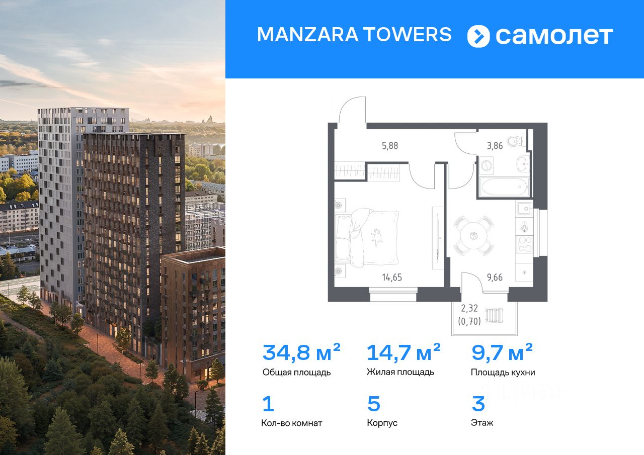 Строим кварталы для жизни с заботой о будущем. Предлагается 1-комнатная квартира комфорт-класса 34,75 кв.м в корпусе 5 на 3 этаже, в MANZARA TOWERS