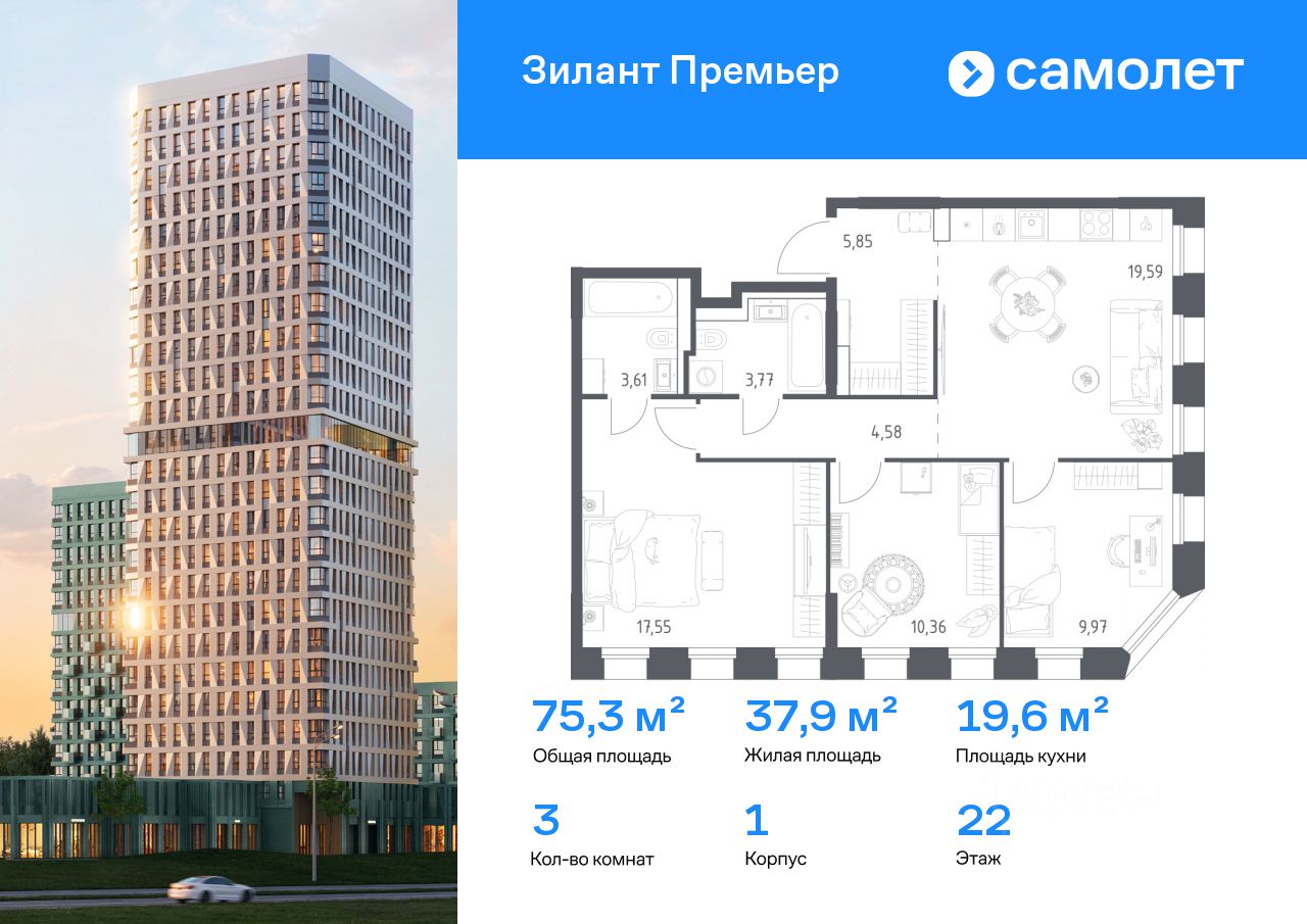 Строим кварталы для жизни с заботой о будущем. Предлагается 3-комнатная квартира комфорт-класса 75,28 кв.м в корпусе 1 на 22 этаже, в ЖК "Зилант Премьер"