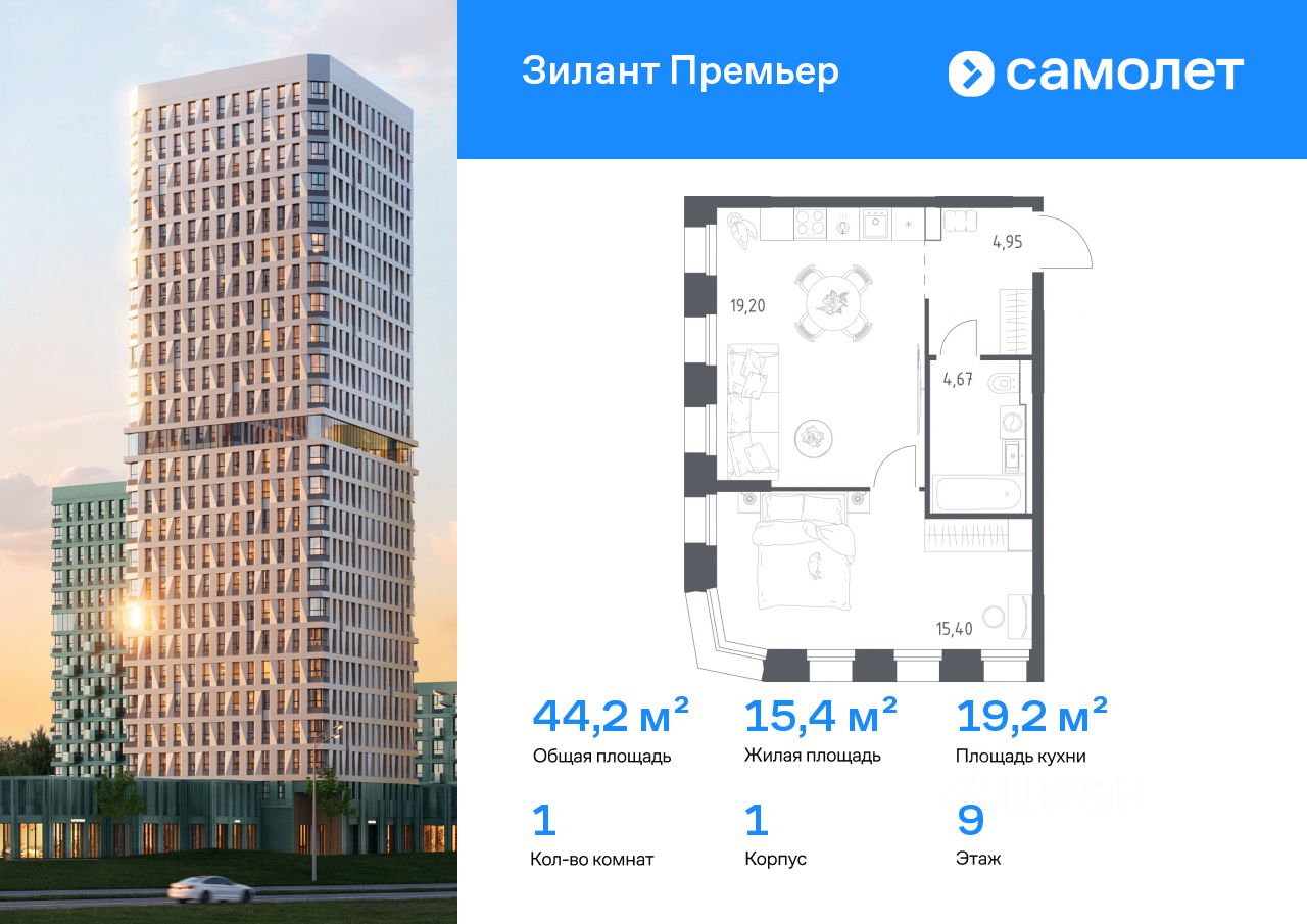 Строим кварталы для жизни с заботой о будущем. Предлагается 1-комнатная квартира комфорт-класса 44,22 кв.м в корпусе 1 на 9 этаже, в ЖК "Зилант Премьер"