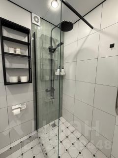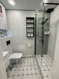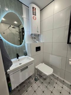 Санузел выложен керамогранитом, установлена инсталляция с подвесным унитазом, стильная душевая с тропическим душем. Также установлен бойлер, водонагреватель.