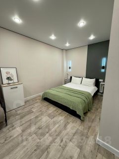 Большая комната разделена условно на две части- гостиная с диваном и зоной для просмотра ТВ, а также спальня с двуспальной кроватью. У изголовья кровати установлены стильные светильники и прикроватные тумбы с выведенными розетками для зарядки телефона.