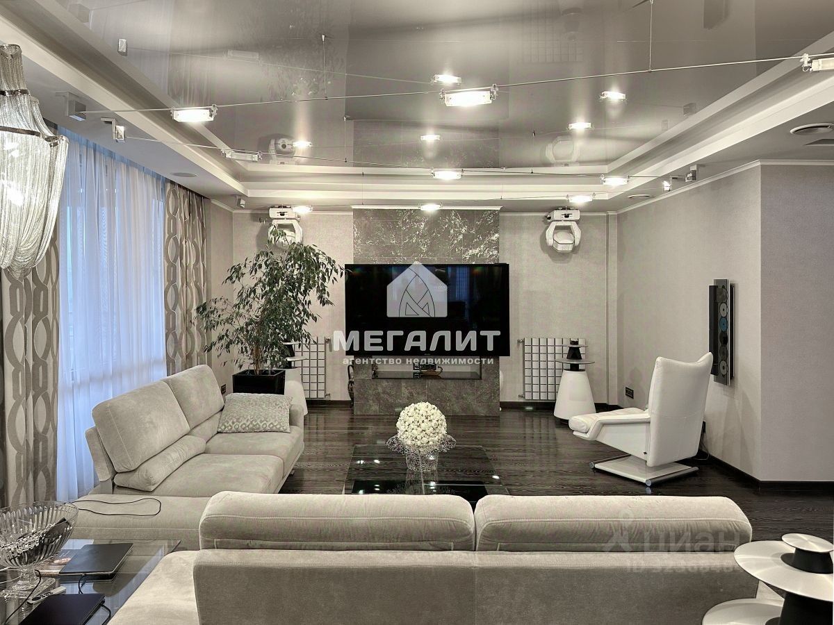 Квартира представлена 3 спальнями, кухней, гостиной, кинозалом с профессиональной шумоизоляцией, зимним садом, хамамом, 3-мя санузлами, гардеробными. Есть 2 действующих дровяных камина.