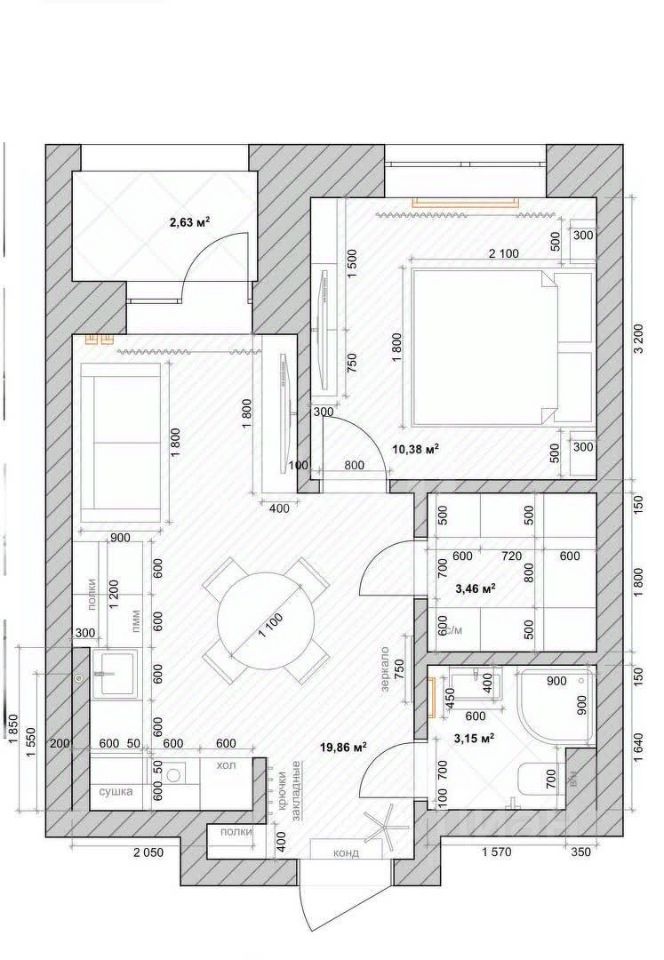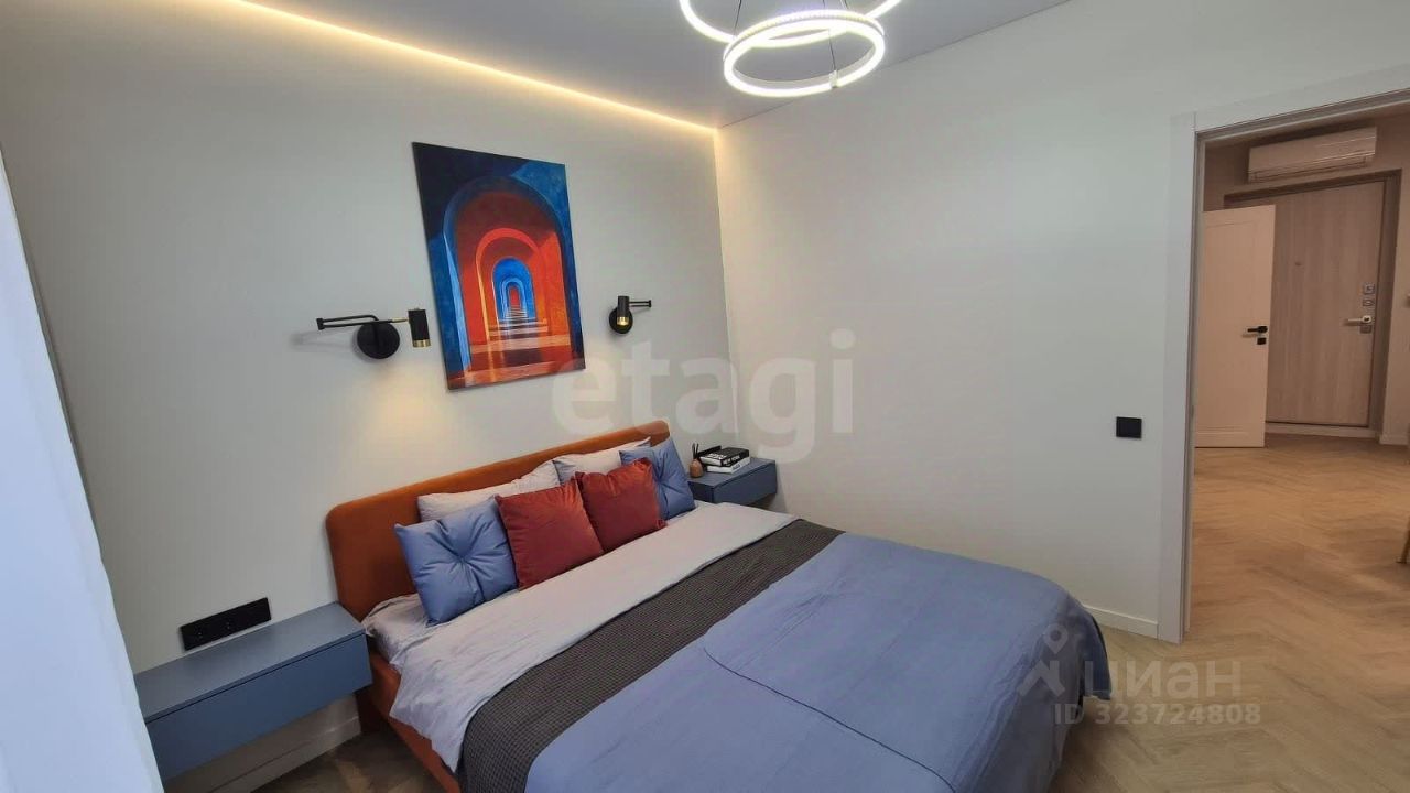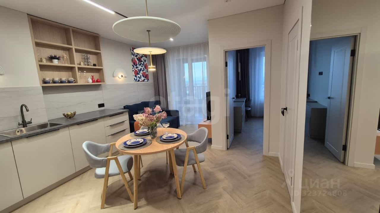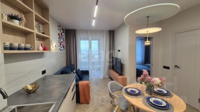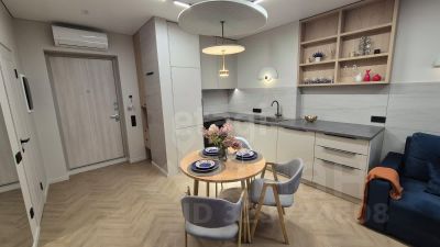 Квартира выполнена с качественным дизайнерским ремонтом и продается с полной меблировкой и техникой, что позволяет заехать сразу после покупки. Планировка включает просторную кухню-гостиную площадью 19.86 кв. м, оснащенную кондиционером и современным кухонным гарнитуром со встроенной техникой: холодильником, посудомоечной машиной, варочной панелью, духовым шкафом и вытяжкой. Зона отдыха обустроена диваном и местом для телевизора. Уютная спальня 10.38 кв. м также оборудована кроватью и телевизионной полкой. Санузел совмещенного типа площадью 3.15 кв. м с душевой кабиной и инсталляцией, дополнен функцией гигиенического душа. Отдельная гардеробная комната площадью 3.46 кв. м обеспечивает достаточное место для хранения.