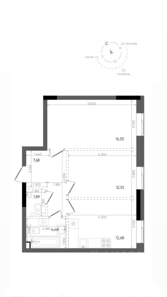 Видовая 2-комнатная на 6 этаже этаже площадью 55,38 м²