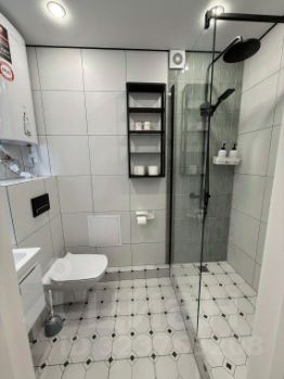 Санузел выложен керамогранитом, установлена инсталляция с подвесным унитазом, стильная душевая с тропическим душем