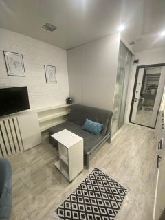 Октябрьская 1 этаж 4/5. Площадь 13,3 кв м. Балкон небольшой, кондиционер, мокрая точка(оборудованная кух зона с раковиной и стиральной машиной), отдельный закрытый тамбур на 2 комнаты в коридоре. Остается вся мебель и бытовая техника.