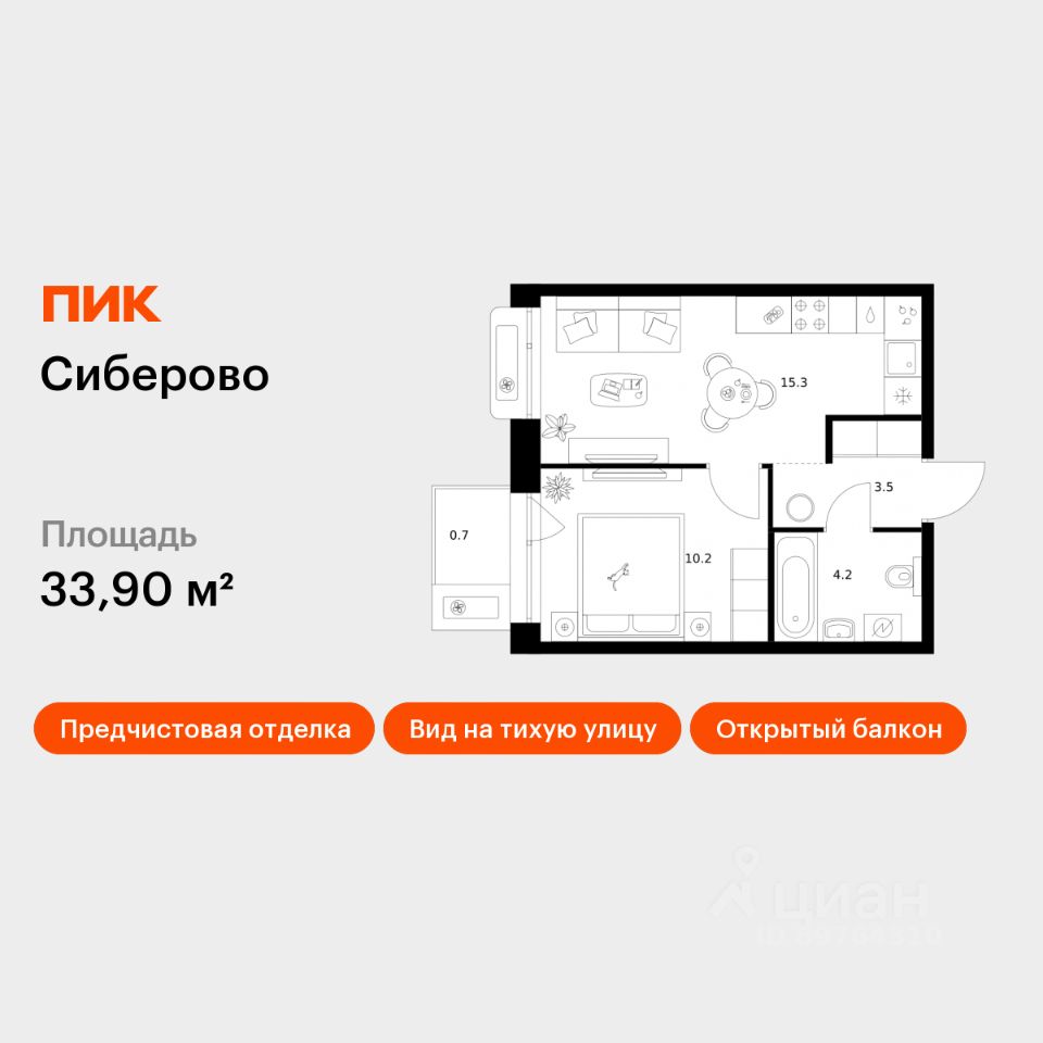Продаётся 1-комн. квартира площадью 33,9 кв.м на 7 этаже 16 этажного дома (Корпус 3, Секция 6) проекта ПИК Сиберово. Светлый просторный подъезд на уровне земли, функциональная планировка, большие окна, предчистовая отделка.
