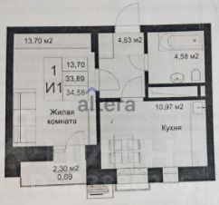 Однокомнатная квартира площадь 34,58м2 на комфортном пятом этаже .