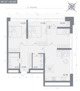 Продаётся 3-комнатная квартира в строящемся доме (Дом 2), срок сдачи: IV-кв. 2027, общей площадью 85.8 кв.м., на 6 этаже.