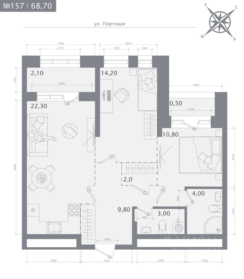 Продаётся 2-комнатная квартира в строящемся доме (Дом 2), срок сдачи: IV-кв. 2027, общей площадью 68.7 кв.м., на 10 этаже.