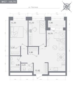 Продаётся 2-комнатная квартира в строящемся доме (Дом 2), срок сдачи: IV-кв. 2027, общей площадью 69.7 кв.м., на 10 этаже.