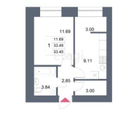 Площадь квартиры составляет 33, 49 м². Оптимальная планировка.