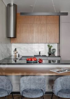 - Просторная кухня-гостиная, оборудованная встроенной техникой (холодильник, посудомоечная машина, варочная поверхность, духовой шкаф, вытяжка).