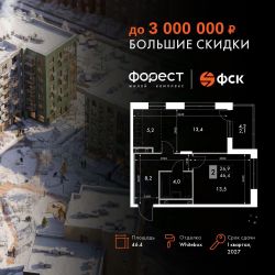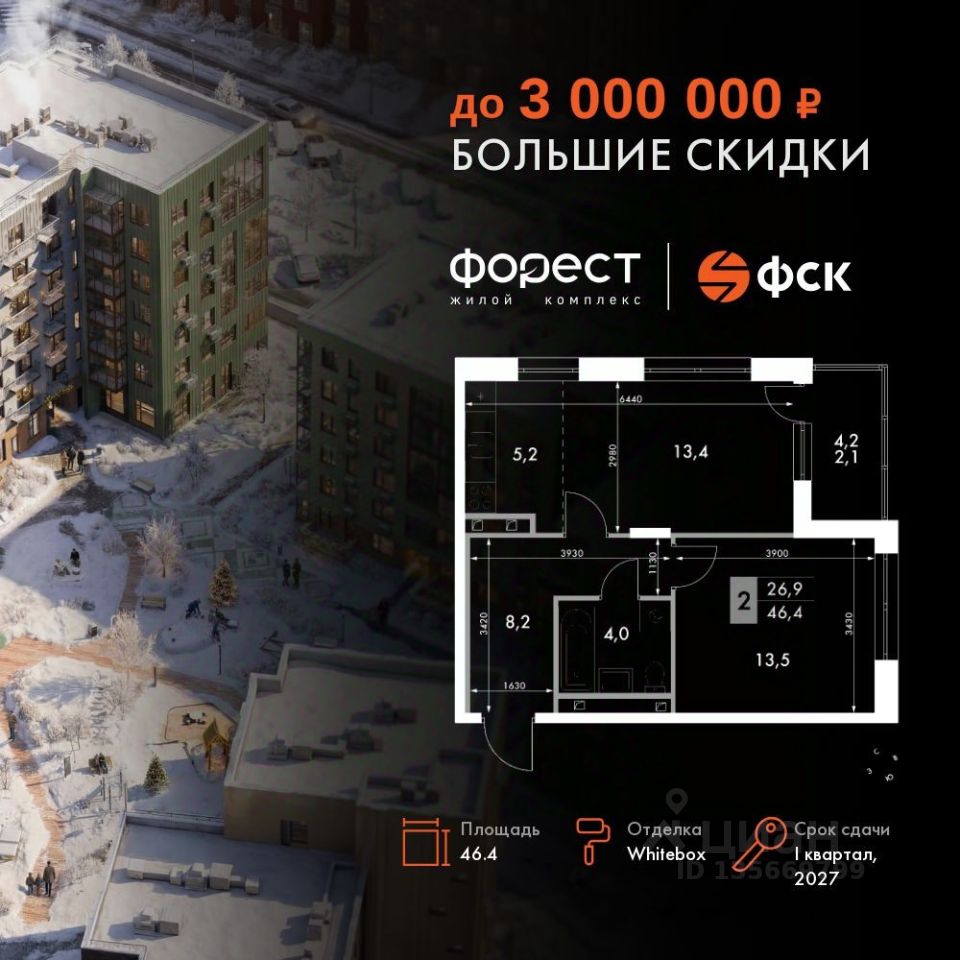 Продаётся 2-к квартира номер 76 общей площадью 46.4 кв.м. на 4-м этаже 6 этажного здания. Отделка Whitebox. Цена с учётом скидки.