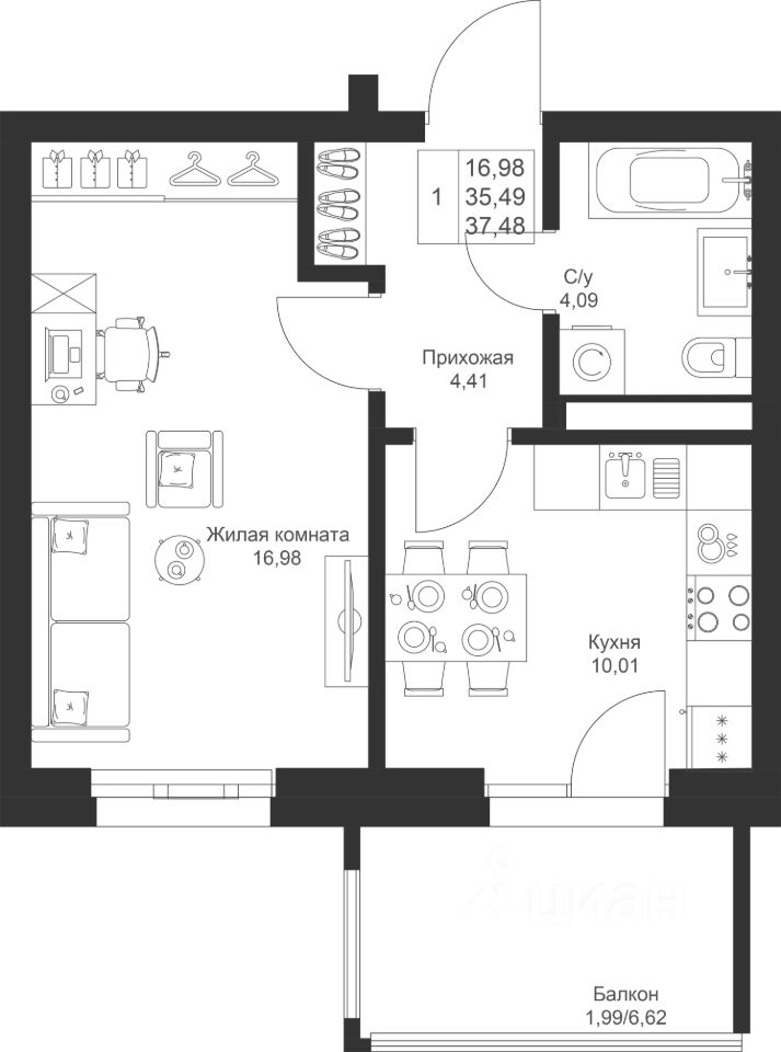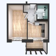 Площадь комнаты позволяет зонировать ее на спальную и гостевую зоны. В проекте функциональная прихожая, чтобы вам было удобно хранить свои вещи.