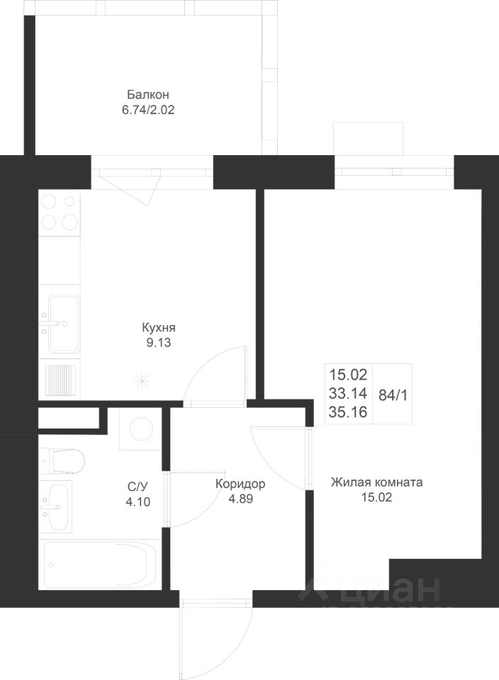 Продается 1-комнатная квартира 84 площадью 35,16 кв.м на 3 этаже в строящемся доме проекта "Новый свет" компании "Ак Барс Дом".