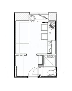 Спальная зона и кухня разделены (в отличие от типовых студий — значительно комфортнее).